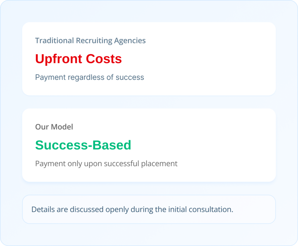 No upfront costs; we charge only after a successful placement.
